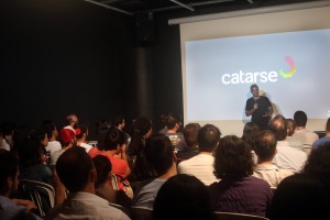 Com o estúdio cheio, Rodrigo começou contando um pouco da história do Catarse. Tudo começou com os amigos Diego Reeberg, de Paranavaí (PR), e Luis Otávio Ribeiro, de Uberaba (MG). Logo se juntou a eles o programador Daniel Weinmann, de Porto Alegre. A partir de um blog em que discutiam o assunto, chamaram a atenção de mais dois irmãos cariocas: Rodrigo (jornalista) e Thiago Maia (designer). Todos eles com o sentimento comum de dor por ver projetos incríveis engavetados, seja por falta de dinheiro/financiamento ou por excesso de burocracia dos editais e fundos setoriais. Em janeiro de 2011, com a proposta de tirar sonhos do papel, os cinco resolveram unir forças, abraçar um caminho comum e lançar a plataforma.